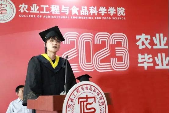 能源2101班赵纪运代表在校生发言,他表达了对毕业学长学姐的感谢与祝福,祝福他们扬起胜利的风帆去创造新辉煌,并表示将以学长学姐勤勉刻苦、努力钻研、勤于实践、敢于创新的作风为榜样,以强农兴农为己任,成为知农爱农的践行者,用热情和智慧续写新篇章。