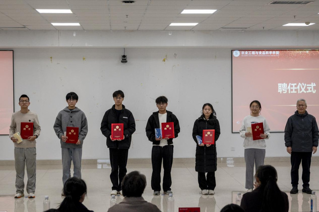 工程图学教学部主任贾鹏宣读《关于聘任2025-2026学年先进成图技术与产品信息建模培训学生讲师的决定》,随后,工程图学教学部校教学名师殷昌贵教授为受聘学生颁发了聘书。