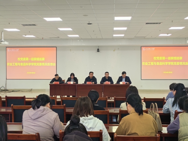 4月8日下午,校党委第一巡察组巡察农业工程与食品科学学院党委情况反馈会在6号实验楼1104室召开。校党委副书记杜方岭出席反馈会议,并对巡察整改工作提出要求。校党委第一巡察组组长王冰反馈了巡察情况。学院领导班子成员、党支部书记、系主任、各科室负责人、教授委员会成员和教师代表参加会议。反馈会由学院党委书记高存福主持。